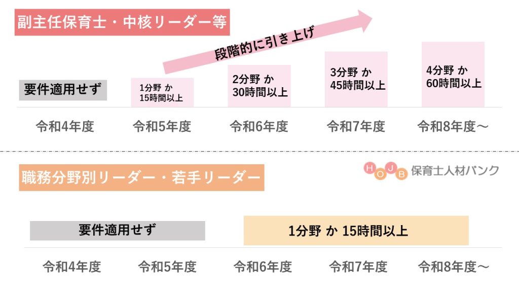 新たに導入されたポジションは、専門リーダーのほか職務分野別リーダーと、副主任保育士の計3つで、それぞれ役割や要件が異なります。