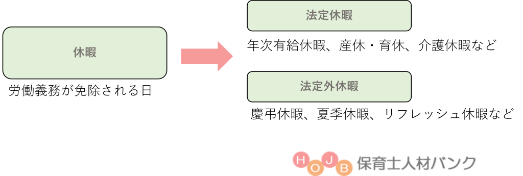 一方、休暇は会社によって労働義務を免除された日のことです。休暇も法律によって義務付けられている「法定休暇」と会社の制度によって与えられる「法定外休暇」に分けることができます。
